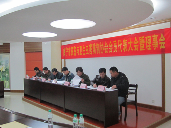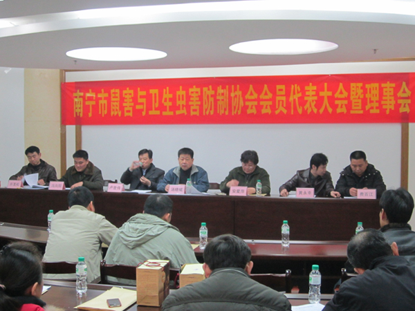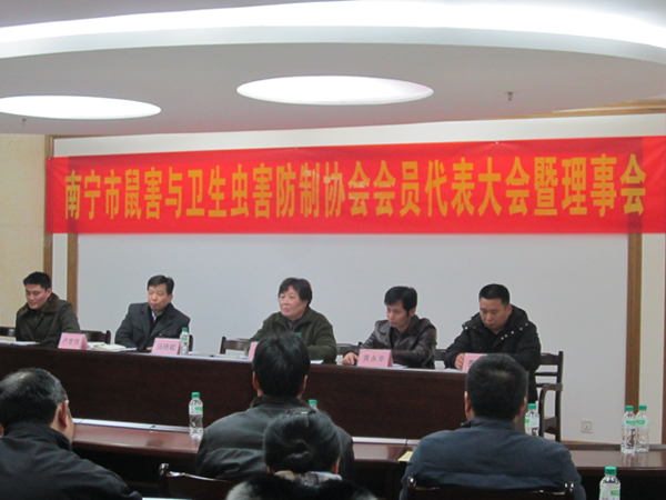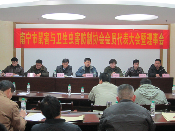 2012年元月9日,南寧市鼠害與衛(wèi)生蟲害防制協(xié)會(huì)在南寧市衛(wèi)生局召開了協(xié)會(huì)理事及全體會(huì)員大會(huì),會(huì)議審議并全體通過了協(xié)會(huì)工作報(bào)告、財(cái)務(wù)報(bào)告及新一屆協(xié)會(huì)領(lǐng)導(dǎo)選舉??祪艄究偨?jīng)理黃永幸先生當(dāng)選新一屆協(xié)會(huì)副會(huì)長(zhǎng)。圖為南寧市衛(wèi)生局長(zhǎng)湯曉斌、愛衛(wèi)辦常務(wù)副主任盧世偉、安愛萍會(huì)長(zhǎng)(原南寧市疾控中心黨委書記)、愛衛(wèi)辦副主任許茂松(協(xié)會(huì)副會(huì)長(zhǎng))、副會(huì)長(zhǎng)馮向陽(廣西自治區(qū)疾控病媒專家)、副會(huì)長(zhǎng)黃永幸、秘書長(zhǎng)費(fèi)百江在主席臺(tái)就座。